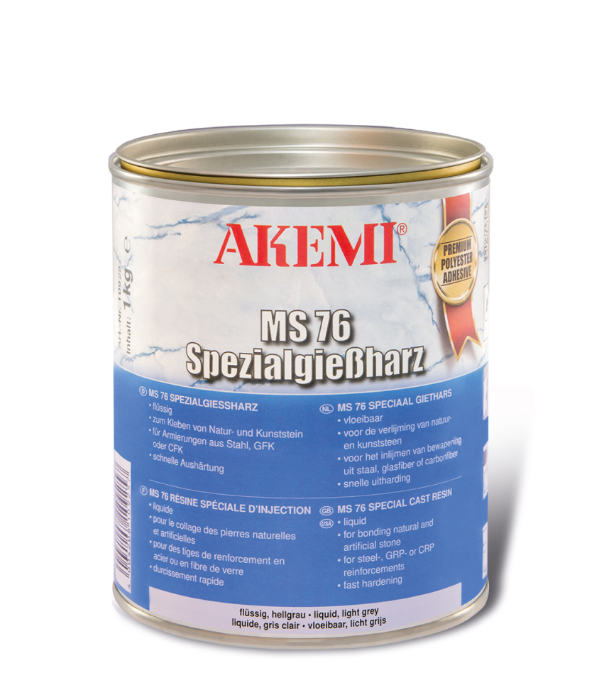 Akemi MS 76 Żywica Poliestrowa do kamienia– dwuskładnikowy klej na bazie żywicy poliestrowej. Klej po utwardzeniu nadaje się do polerowania.