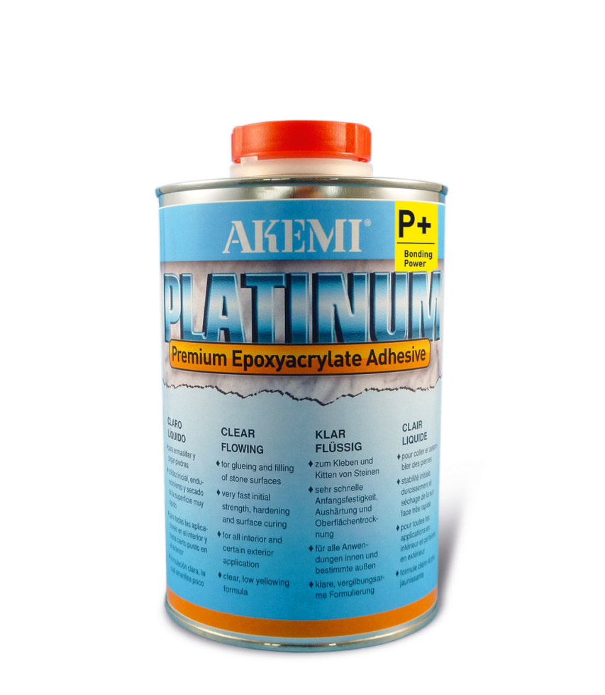 Akemi PLATINUM płynny klej do kamienia– Klej, żywica na bazie epoksy-akrylatu o wysokiej wytrzymałości, bardzo krótkim czasie schnięcia umożliwiający dalszą obróbkę.